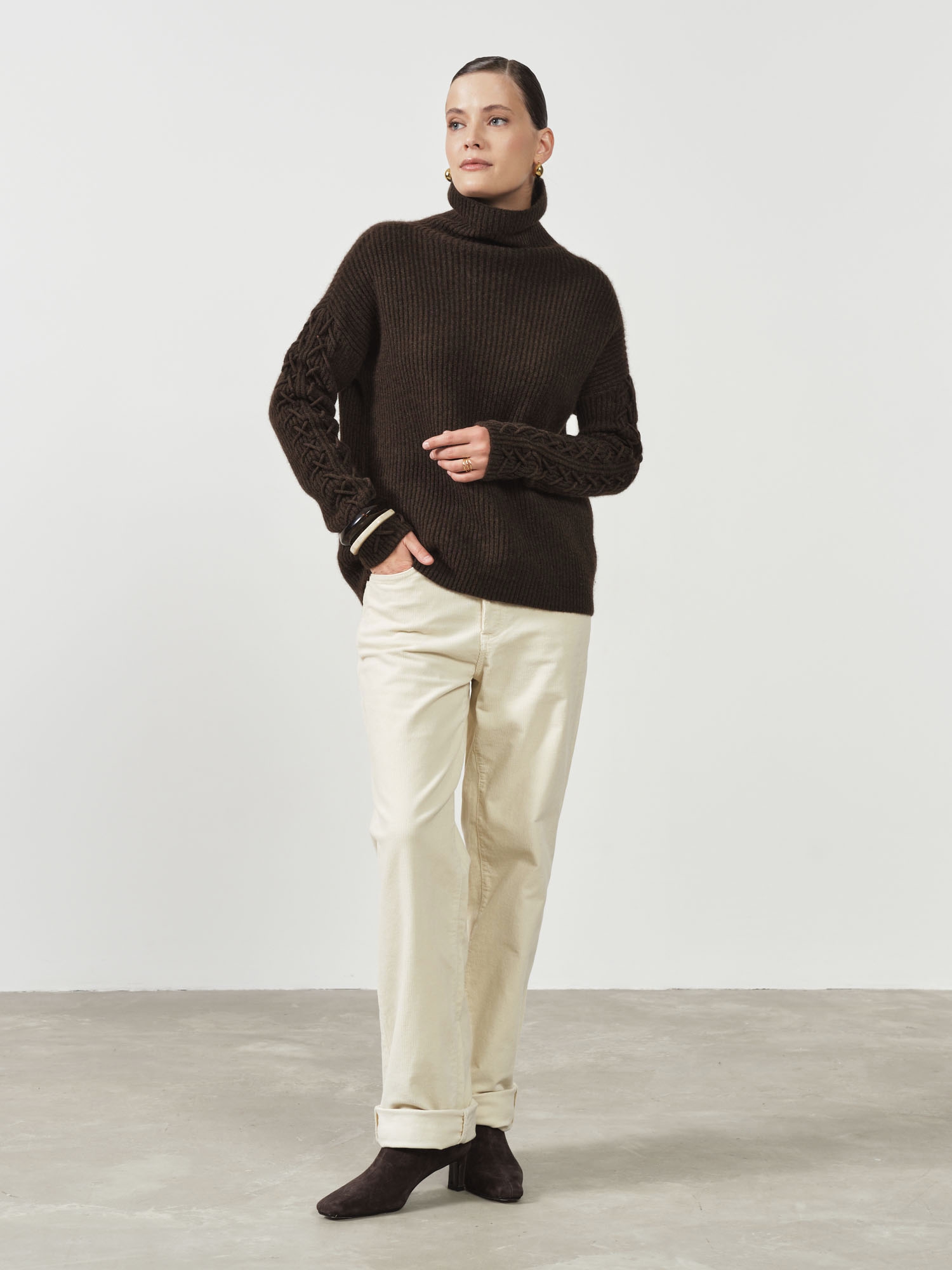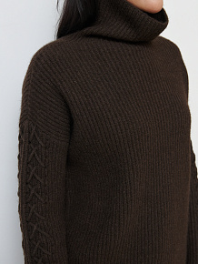 Высокий воротник-стойка, фактурная вязка и декоративные элементы на рукавах создают выразительный и благородный образ.